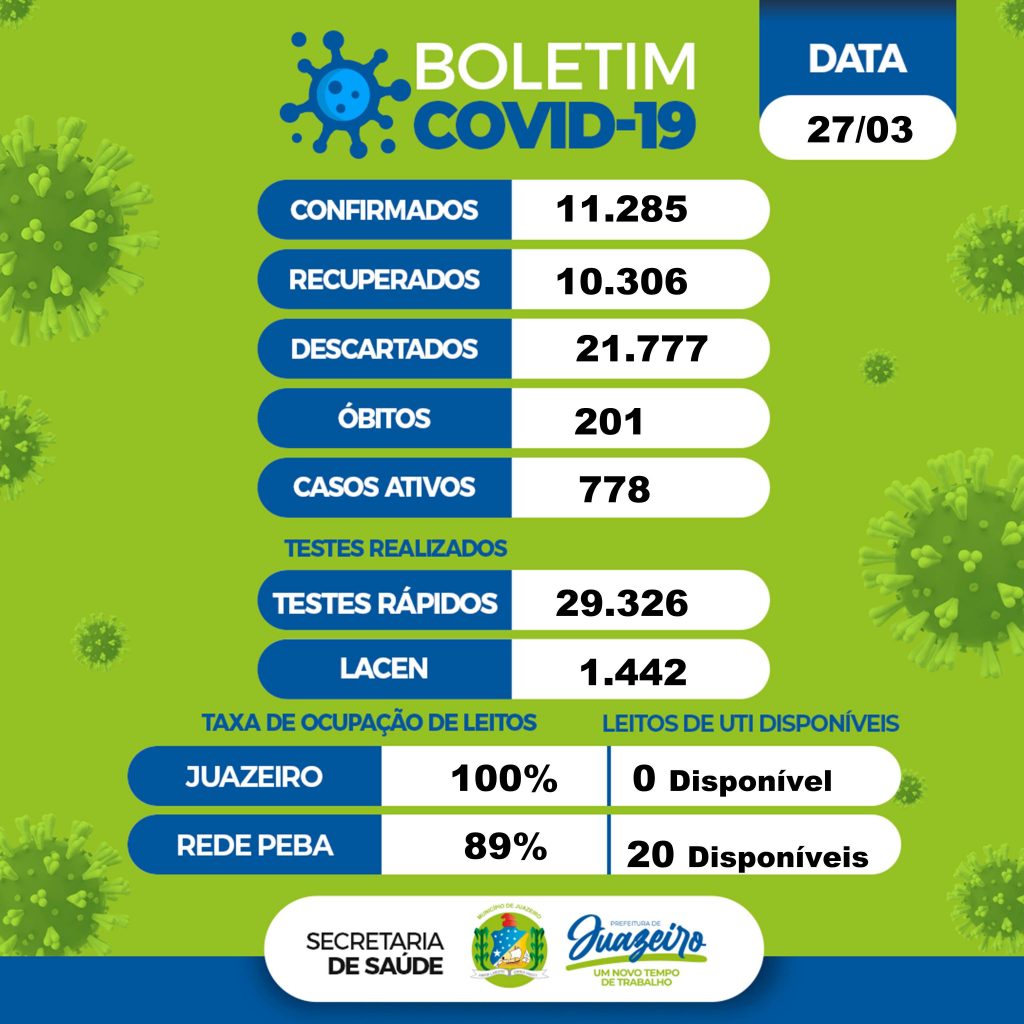 Juazeiro registrou dois óbitos por complicações da Covid-19 e 61 novos casos da doença nas últimas 24 horas. A informação está no boletim epidemiológico da Secretaria Municipal de Saúde deste sábado (27). O levantamento mostra que 11.285 moradores foram infectados desde o início da pandemia na cidade, dos quais 10.306 já estão recuperados. Os casos […]