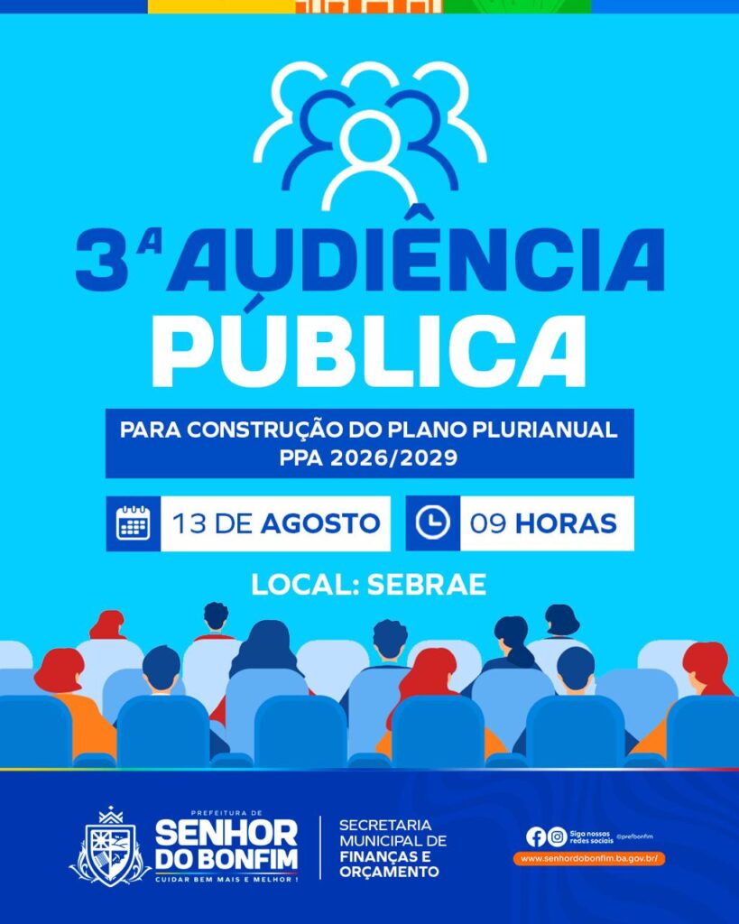 A Prefeitura de Senhor do Bonfim, por meio da Secretaria Municipal de Finanças e Orçamento, realiza nesta quarta-feira (13), às 9h, no auditório do Sebrae, a 3ª Audiência Pública para a construção do Plano Plurianual (PPA) 2026–2029. A audiência é aberta a toda a população, que poderá apresentar propostas e sugestões para contribuir com o […]