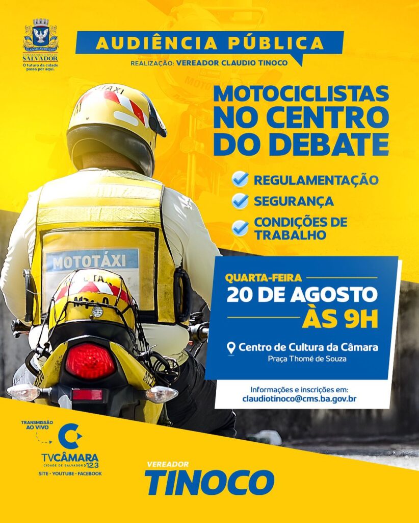 O vereador Claudio Tinoco (União Brasil) vai realizar, na próxima quarta-feira (20), às 9h, uma audiência pública para discutir a situação dos motociclistas que trabalham em Salvador. O encontro será no Centro de Cultura da Câmara Municipal e vai reunir representantes da categoria, autoridades e especialistas. A audiência deve tratar de temas como regulamentação, segurança […]