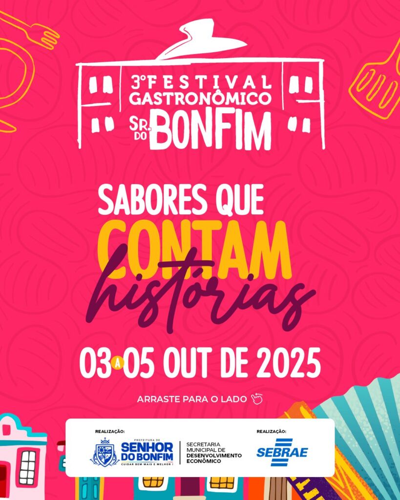 A Prefeitura de Senhor do Bonfim, por meio da Secretaria Municipal de Desenvolvimento Econômico e Turismo, em parceria com o Sebrae (Serviço Brasileiro de Apoio às Micro e Pequenas Empresas), abriu nesta segunda-feira, 18 de agosto, as inscrições para o 3º Festival Gastronômico de Senhor do Bonfim. O evento, que acontece de 3 a 5 […]