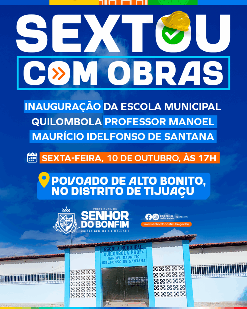 A Prefeitura de Senhor do Bonfim, em mais uma edição do “Sextou com Obras”, realiza nesta sexta-feira (10), às 17h, a entrega da Escola Municipal Quilombola Professor Manoel Maurício Idelfonso de Santana, no povoado de Alto Bonito, distrito de Tijuaçu. Com investimento de quase R$ 500 mil em recursos próprios, a nova unidade escolar representa […]