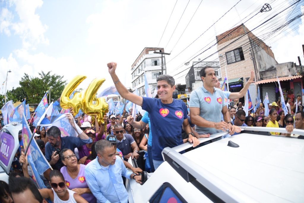 O bairro da Plataforma, no Subúrbio Ferroviário de Salvador, amanheceu neste domingo (9) ao som do pagode ‘Vai Neto’ estilo paredão, com os adesivos do 44 nos muros das casas e no peito das pessoas. Nas ruas estreitas, a cor azul predominava entre os apoiadores do candidato a governador ACM Neto (União Brasil). Não era Carnaval, mas parecia: ao lado do prefeito Bruno Reis (UB), ele arrastou uma multidão que saiu de casa para demonstrar apoio ao ex-prefeito da capital baiana na corrida pelo governo do estado.