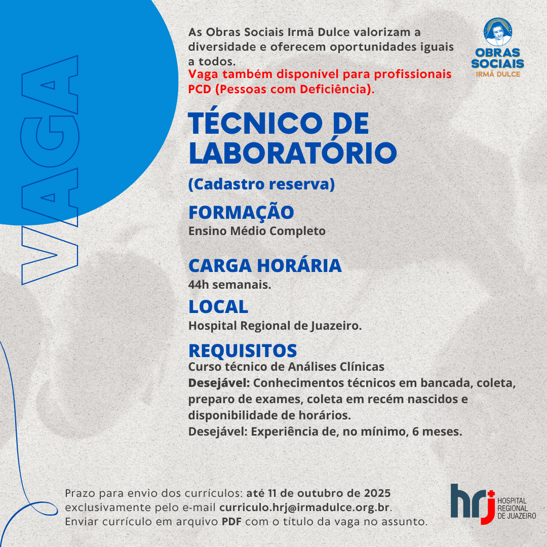O Hospital Regional de Juazeiro (HRJ), administrado pelas Obras Sociais Irmã Dulce (OSID), abriu nesta terça-feira (07), o processo seletivo para os cargos de técnico de laboratório e auxiliar de serviços gerais (asg). Os interessados devem enviar o currículo anexado em formato PDF através do endereço de e-mail curriculo.hrj@irmadulce.org.br, até o dia 11 de outubro (sábado). No assunto do e-mail, deve ser informado o nome da vaga que deseja concorrer.