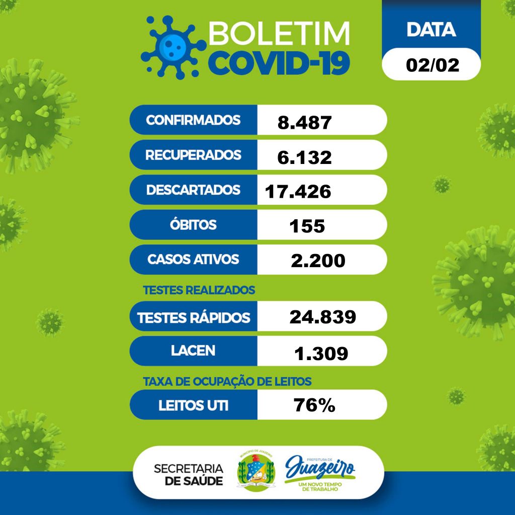 Juazeiro registrou 34 novos casos da Covid-19 nas últimas 24 horas. A informação está no boletim epidemiológico da Secretaria de Saúde desta terça-feira (02).