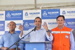 Mais uma área de risco para deslizamento de terra em Salvador foi beneficiada com aplicação de geomanta. A estrutura foi inaugurada pelo prefeito Bruno Reis e pelo diretor geral da Defesa Civil de Salvador (Codesal), Sosthenes Macedo, nesta quinta-feira (5), na Rua J, Caminho 1, 3ª Etapa, no bairro de Castelo Branco.