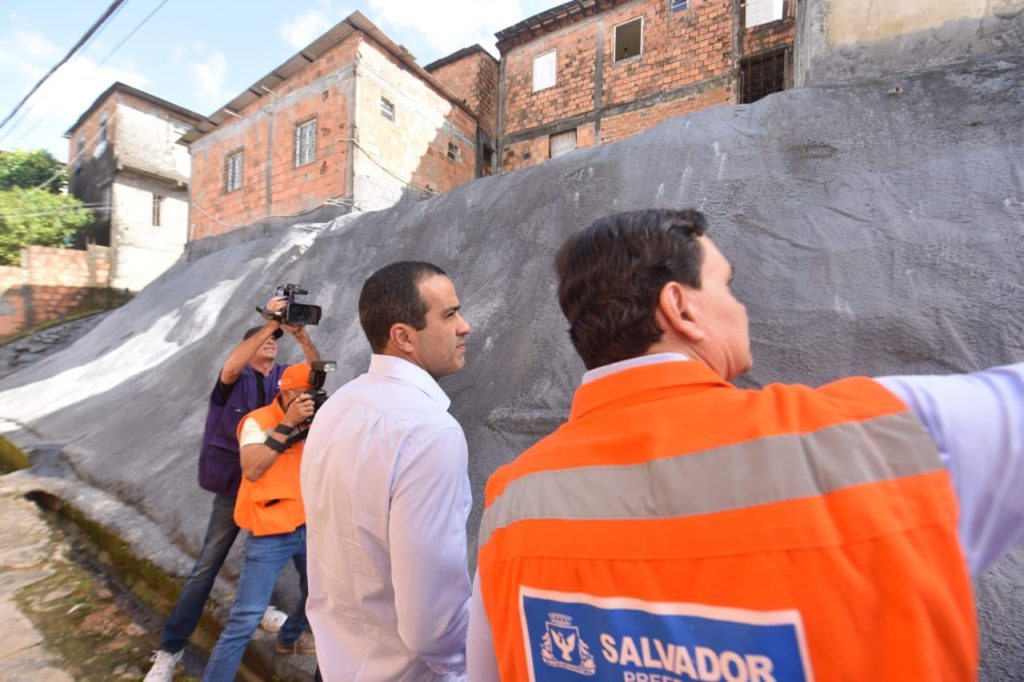 Mais uma área de risco para deslizamento de terra em Salvador foi beneficiada com aplicação de geomanta. A estrutura foi inaugurada pelo prefeito Bruno Reis e pelo diretor geral da Defesa Civil de Salvador (Codesal), Sosthenes Macedo, nesta quinta-feira (5), na Rua J, Caminho 1, 3ª Etapa, no bairro de Castelo Branco.