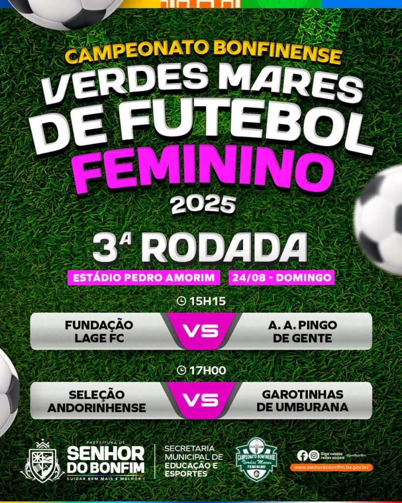 A Prefeitura de Senhor do Bonfim, por meio da Secretaria Municipal de Educação e Esportes, realiza neste domingo (24), no Estádio Pedro Amorim, a 3ª rodada do Campeonato Bonfinense Verdes Mares de Futebol Feminino 2025.