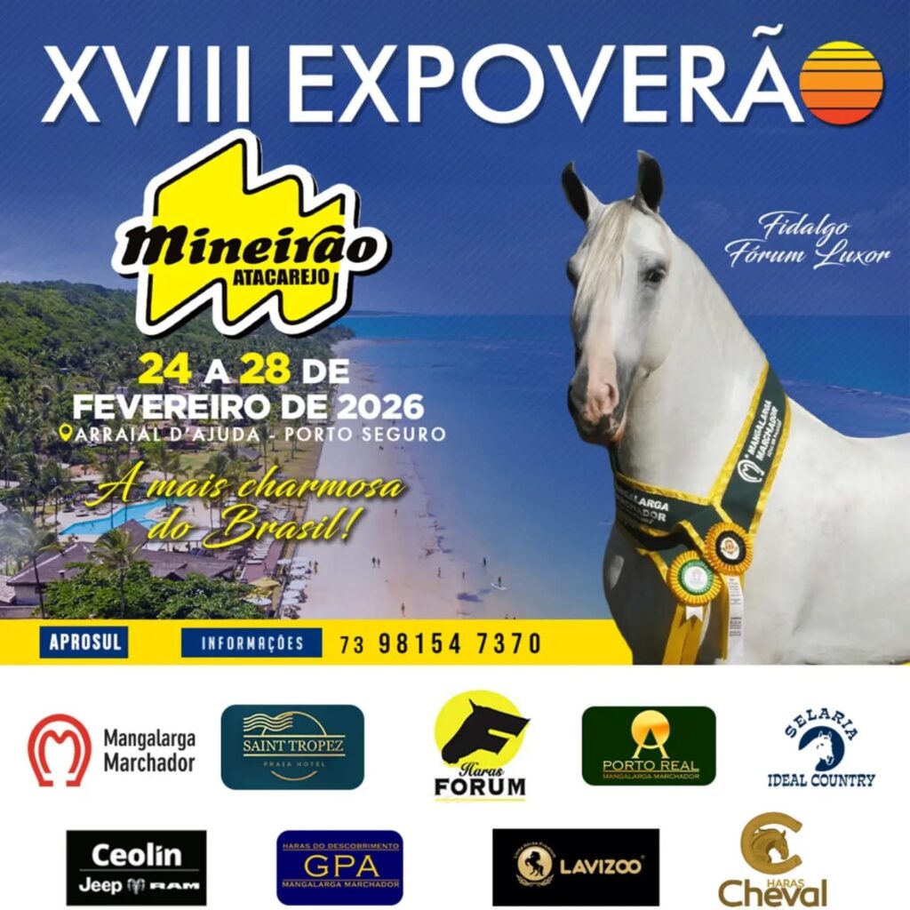 A APROSUL tem a honra de convidar você e sua família para participar da XVIII EXPOVERÃO, a mais tradicional e charmosa exposição de cavalos Mangalarga Marchador do Brasil. O evento será realizado no Parque Central em Arraial D’ajuda, Porto Seguro, Bahia, de 24 a 28 de fevereiro de 2026.